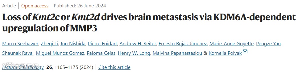 2024年6月26日,来自美国丹娜-法伯癌症研究所的Kornelia Polyak团队在Nature Cell Biology上在线发表了文章Loss of Kmt2c or Kmt2d drives brain metastasis via KDM6A-dependent upregulation of MMP3,发现在非转移性TNBC小鼠模型中,Kmt2c或Kmt2d的缺失会导致转移(尤其是脑转移),揭示了KMT2C或KMT2D缺失通过KDM6A依赖的方式促进MMP3的表达,从而驱动TNBC的脑转移的新机制,不仅在表观遗传层面为TNBC的治疗提供了新的视角,也为开发针对脑转移的靶向治疗策略提供了潜在靶点。