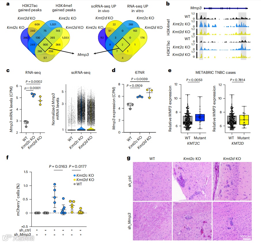为了识别Kmt2c KO和Kmt2d KO细胞转移表型的共同表观遗传调控因子,研究者整合了显著增加的H3K4me1和H3K27ac peaks以及在癌细胞的RNA-seq和scRNA-seq中显著上调的基因,鉴定出基质金属蛋白酶3 (Mmp3)是唯一重叠的基因(Fig.5a)。研究者确认了Mmp3位点上富集的H3K4me1和H3K27ac信号强度(Fig.5b),并发现两种168FARN和67NR KO衍生细胞中显著上调了Mmp3表达(Fig.5c,d)。更重要的是,在具有KMT2C突变的人类三阴性乳腺癌(TNBC)中,MMP3表达显著高于WT肿瘤,并且MMP3高表达的肿瘤具有显著更高的KMT2C突变频率(Fig.5e)。