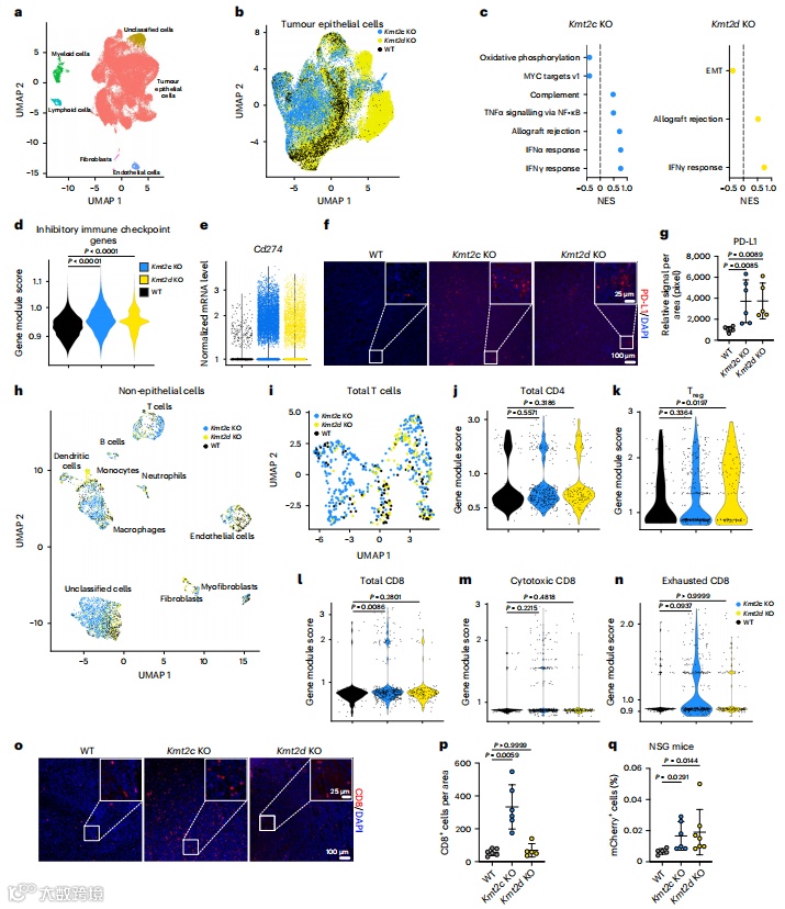 Fig 2.Kmt2c和Kmt2d缺失对肿瘤免疫微环境的不同影响