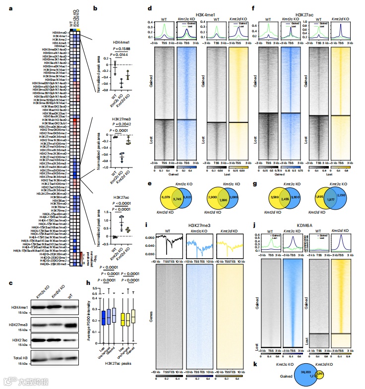 为了解析KMT2C或KMT2D基因丢失诱导的细胞内在变化,研究者深入探究了KMT2C和KMT2D两种组蛋白甲基转移酶基因敲除(KO)对细胞组蛋白修饰的影响。定量组蛋白质谱分析显示,与野生型(WT)细胞相比,两种KO细胞的组蛋白修饰模式相似(Fig.3a),但H3K4me1和H3K27me3在Kmt2c KO细胞中显著减少,但在Kmt2d KO细胞中没有减少,而H3K27ac则在2种KO细胞系中都显著增加(Fig.3b)。免疫印迹分析显示H3K4me1水平相似,但在两种KO细胞系中H3K27me3减少,H3K27ac增加(Fig.3c)。此外,通过ChIP-seq技术,研究者观察到Kmt2c KO和Kmt2d KO细胞中H3K4me1和H3K27ac的峰值出现显著的增加或减少,而H3K27me3的峰值变化不大。这些变化是局部的而非全局性的,并且每种KO细胞的变化具有独特性(Fig.3e,f,g)。由于KMT2C和KMT2D是H3K4的甲基转移酶,但H3K27ac的增加可能是由于这些酶活性丧失的间接效应。P300,一种H3K27乙酰转移酶,其信号强度与H3K27ac的变化显著相关,表明P300可能在KO细胞中调节H3K27ac的水平(Fig.3i)。同时,KDM6A,一种H3K27me3的去甲基化酶,其ChIP-seq结果显示KO细胞中KDM6A峰值显著增加,但与H3K27ac的增加重叠较少 (Fig.3j),两种KO细胞系之间增加的独特的KDM6A峰值多于共有的(Fig.3k),这可能影响H3K27me3的水平。
