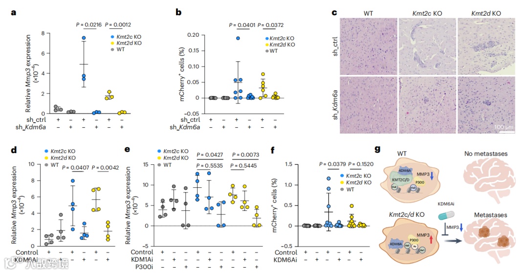 Fig6.抑制KDM6A可降低Kmt2c KO和Kmt2d KO诱导的Mmp3表达和脑转移
