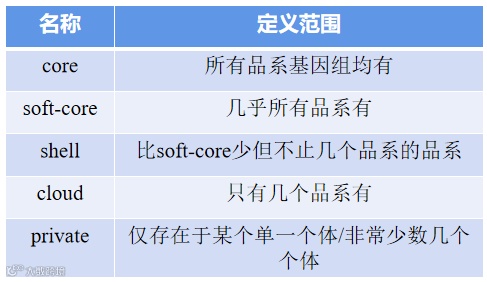 泛基因组分析通过对每个个体中共有情况进行基因集聚类,通常分为以下三种:核心基因(core gene)、非必需基因(dispensable gene)和特有基因(Private)。除了这三个分类,在某些研究中还有更细的分类。