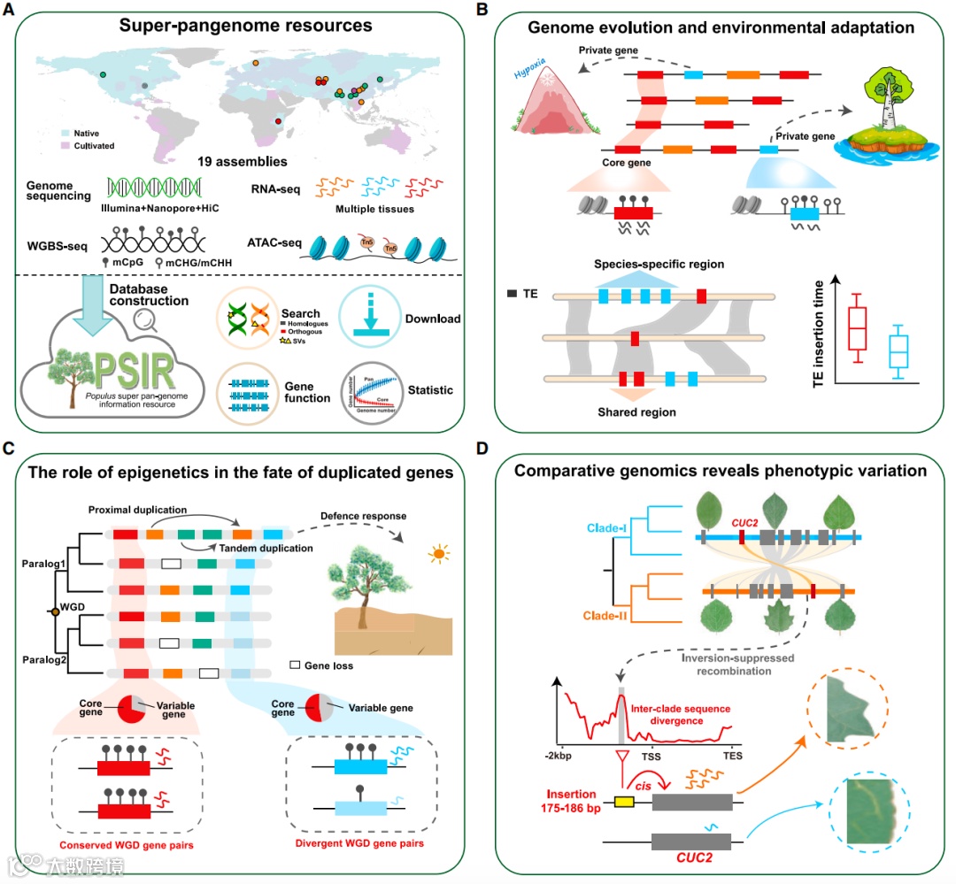 2024年,四川大学和南京林业大学等团队合作构建杨属物种属级水平超泛基因组,并结合转录组、甲基化组WGBS、染色质可及性ATAC-seq、群体重测序、基因功能验证等多维度、多尺度证据,深入解析了基因组同源/等位变异和表观遗传调控在杨属物种形态特征多样化和差异环境适应性中的潜在作用和可能机制[7]。