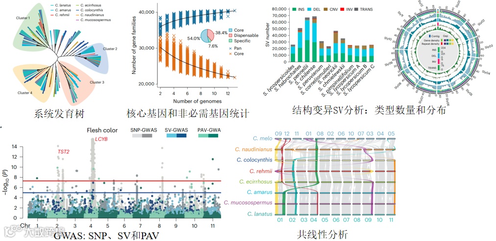 泛基因组文章中常见的高频分析结果有系统发育树、核心基因和非必需基因统计分类、结构变异分析、共线性分析和GWAS分析,涵盖了从进化分析到变异分析、基因组结构和功能基因挖掘等多方面内容。