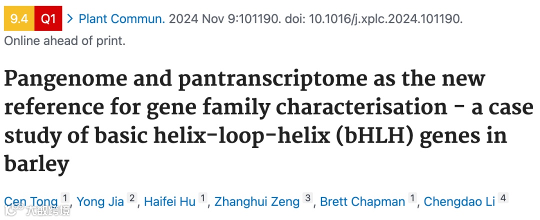 近日,澳大利亚莫道克大学李承道院士团队在Plant Communications 在线发表了题为 “Pangenome and pantranscriptome as the new reference for gene family characterisation -a case study of basic helix-loop-helix (bHLH) genes in barley”的研究论文,为泛基因组和泛转录组时代的基因家族分析提供了一个新参考——大麦bHLHs基因的案例研究:首个将泛基因组基因家族分析与泛转录组数据整合在一起的研究。