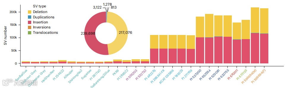 泛基因组分析的重点之一就是结构变异,主要有几种类型:缺失(deletions)、 插入(insertions)、重复(duplications)、倒位(inversions)和异位(translocations)。比对参考基因组鉴定结构变异,然后统计SV数量和分布占比。此外,研究中通常利用PCR验证SV结果。