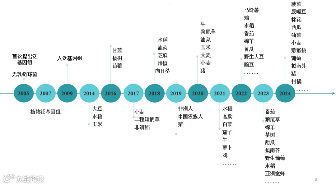2005年,Tettelin等在无乳链球菌的研究中首次提出泛基因组的概念,包括所有菌株中都存在核心基因组和部分菌株中特有的非必需基因组。2007年,Morgante等首次将这一概念引入植物研究,但当时限于测序技术和成本,并没有大规模应用。2014年,陆续报道了大豆、水稻和玉米等植物的泛基因组。后来随之测序技术的发展,尤其是三代技术,许多植物的泛基因组得到构建,近两三年相关报道明显增加了不少。