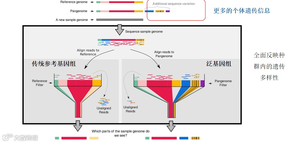 单一参考基因组的局限性,由此“泛基因组”应运而生,它是指一个物种中所有个体的基因组信息的集合,包含核心基因组、非必需基因组和特有基因组。
