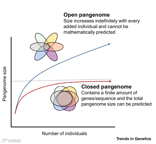 根据下面的拟合曲线,可以将泛基因组分为两类:开放泛基因组(Open Pangenome)和封闭泛基因组(Closed Pangenome)。开放泛基因组指的是物种或种群的泛基因组规模可以持续增加,随着新个体的加入,泛基因组会不断引入新的基因,没有明显的上限。封闭泛基因组指的是物种或种群的基因组规模有限,随着新个体的加入,泛基因组的总大小趋于稳定,不再显著增加。