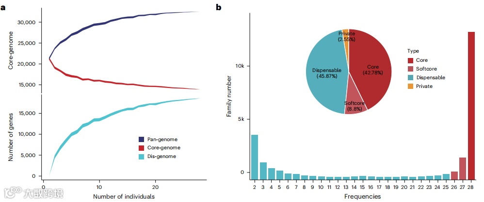 泛基因组特征分析除了对基因进行分类,还会分析基因组大小和核心基因组大小(下图a),有多少基因/基因家族在所有个体中都存在。泛基因组中基因频率分布描述了基因在物种或群体基因组之间的保守和可变性。基因频率分布,经常呈现不对称的首尾高中间低的分布形式(U形),表明大多数基因要么以核心基因组的形式存在于绝大多数个体中,要么存在于个别个体中(下图b)。核心基因通常比较保守,多为管家基因,能够反映该物种的稳定性;非必需基因通常具有特定环境适应性,与个体的特性和防御反应相关[1]。