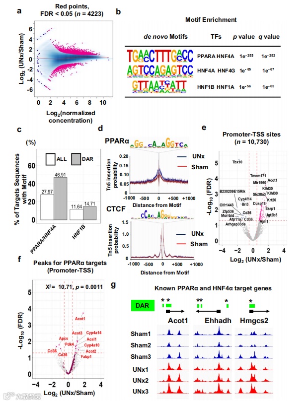 接下来作者在单侧肾切除后24小时,通过ATAC-seq分析S1近端小管的染色质可及性。UNx与对照组相比有4223个(3.4%)peak发生显著改变(图2.A)。为了研究特定的转录因子通路是否与UNx样本中染色质可及性的增加有关,作者对UNx中染色质可及性显著增加的peak进行了motif富集分析,显著富集的是肝细胞核因子-4(HNF4α)和过氧化物酶体增殖物激活受体(PPARα)对应的结合位点基序,它们是两种脂质调节的转录因子(图2.B、C)。对PPARα进行转录因子足迹分析,显示UNx样本中PPARα基序周围的染色质可及性增加(图2.D、E),PPARα和HNF4α靶基因的可及性在UNx组中显著上调(图2.F、G)。这些数据表明,UNx处理后PPARα结合基序的占据率升高,提示PPARα途径在UNx反应中发挥作用。