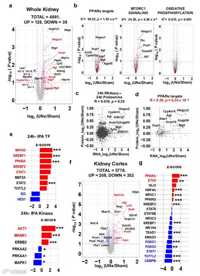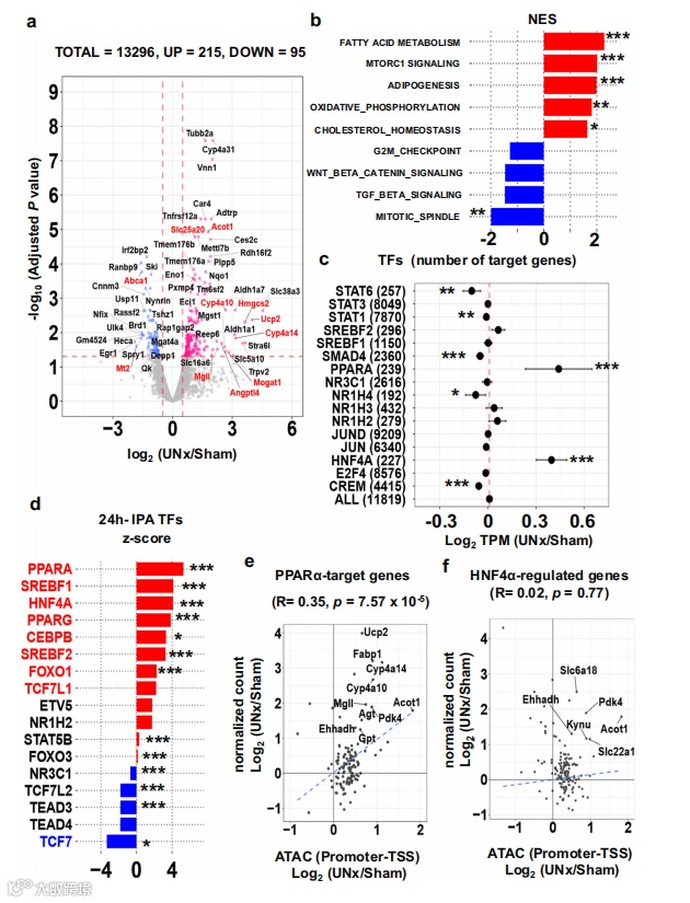 接下来,作者对术后24小时的S1近端小管进行了RNA-seq,探究HNF4α和PPARα靶基因的表达变化。与对照组相比,UNX组中有215个基因表达显著增加,95个基因表达减少(图3.A),基因富集分析(GSEA)结果显示脂肪酸代谢生物过程显著富集(图3.B),PPARα和HNF4α靶基因的表达量也显著增加(图3.C)。此外,IPA分析预测了PPARα、SREBF1和HNF4α等转录因子以及STK11和INSR等激酶的激活(图3.D),而且PPARα靶基因的ATAC-seq数据和RNA-seq数据显示出高度相关性(图3.E),但HNF4α的靶基因则未表现出相关性(图3.F),提示 UNx 后肾小管代偿性肥大期间 PPARα 在基因启动子处有转录激活作用。
