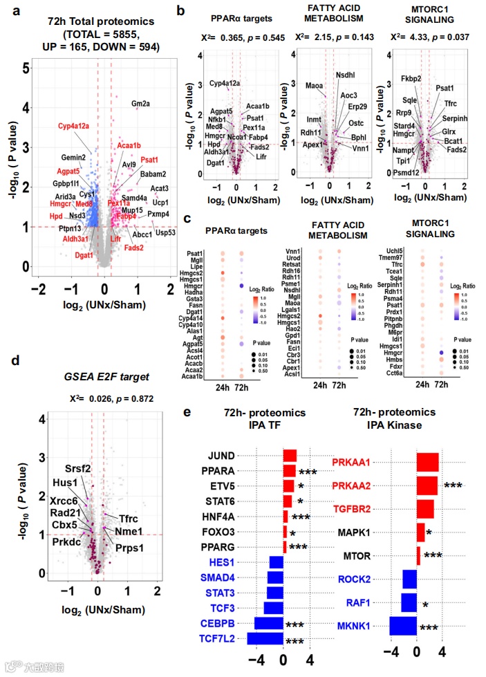 术后72h的蛋白质组学结果(图7.A)显示,PPARα的靶蛋白和脂肪酸代谢通关的蛋白的变化已不再明显(图7.B、C),与RNA-seq结果一致,E2F的靶蛋白没有明显上调(图7.D),IPA分析结果显示转录因子PPARα和HNF4α以及AMPK激酶均被激活(图7.E)。