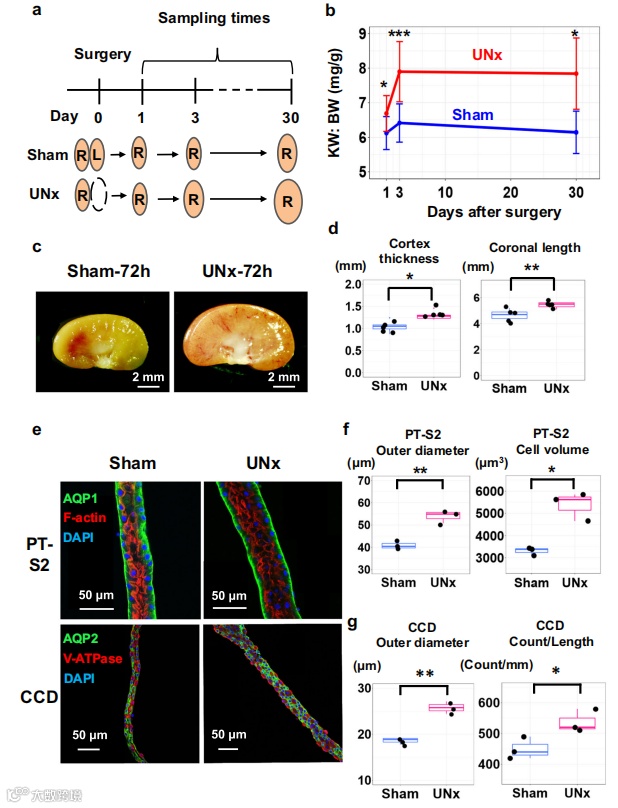 1. 单侧肾切除术(UNX)后的代偿性肥大发生迅速,主要是由于近端小管中细胞体积的增加。