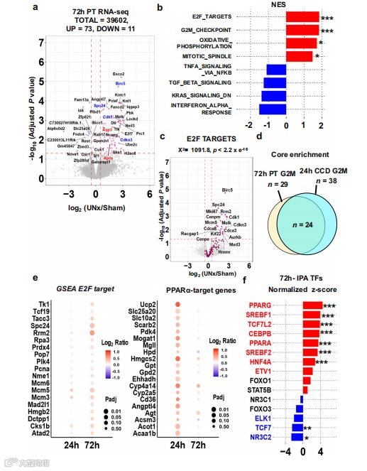接下来,作者又对72h的S1近端小管进行了RNA-seq(图5.A),与72h集合管的结果一致,“E2F_TARGETS”和“G2M_CHECKPOINT”两个通路显著富集(图5.B),E2F相关靶基因显著上调(图5.C),表明近端小管虽然无形态学上的增生表型,但是有增殖的趋势(图5.D)。PPARα靶基因在72h时表达变化已不再明显(图5.E),但IPA分析显示SREBF1、PPARα和HNF4α转录因子仍被激活(图5.F),这表明此时细胞受到的影响似乎已趋于稳定,而 PPARα 和 HNF4α 则一直是重要的调节因子。