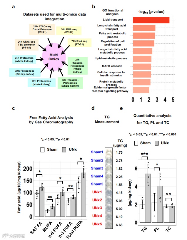 接下来作者对ATAC-seq、RNA-seq和蛋白组的数据进行联合分析(图8.A),GO分析显示了脂肪酸代谢通路的显著变化(图8.B),PPARα内源性配体是饱和脂肪酸和不饱和脂肪酸或其衍生物,接下来使用气相色谱检测了肾脏中的脂肪酸水平,与对照组相比,UNX组中饱和脂肪酸和不饱和脂肪酸浓度显著升高(图8.C),另外小鼠肾脏脂质含量的定量分析显示,UNx组肾脏中甘油三酯和磷脂的浓度也显著增加,这与脂肪酸浓度增加一致(图8.D、E)。单侧肾切除后肾脏中内源性PPARα配体水平的显著增加,揭示了在这一背景下PPARα激活的潜在机制。