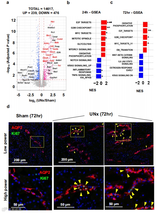 接下来作者对皮质集合管进行了RNA-seq。术后24h的RNA-seq数据显示大量与细胞增殖相关的基因增加,包括E2F的靶基因(图4.A),GSEA分析表明与“E2F_TARGETS”、“G2M_CHECKPOINT”通路显著富集(图4.B),对72 h的RNA-seq数据进行GSEA富集分析,与24 h一致(图4.C),Ki-67标记在72 h的结合管细胞中显著增加(图4.D)。这些结果表明,在肾脏代偿性肥大过程中,皮质集合管发生了显著的增殖反应。