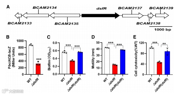 为了验证这一点,作者在dsfR缺失突变体中构建了PbclACB-lacZ报告系统。通过测量β-半乳糖苷酶活性发现,dsfR缺失突变体中bclACB的表达显著低于野生型菌株,表明DsfR正向调控bclACB的表达(图2B)。此外,dsfR缺失突变体的生物膜形成、运动性和毒力分别降低至野生型菌株的61.07%、36.09%和46.35%,这表明DsfR通过群体感应系统调控相关的表型(图2C-E)。