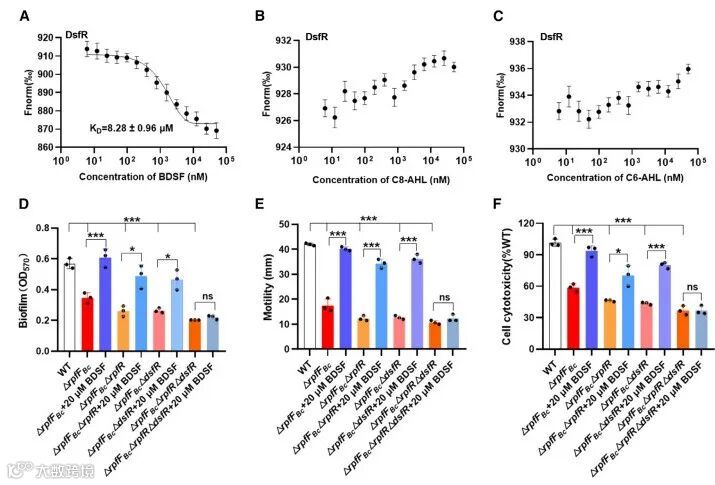 由于DsfR作为调控因子控制QS表型再结合前人的研究成果,所以作者推测了DsfR是否是与BDSF或AHL结合来控制生物学功能,还是与这两者都结合来控制生物学功能。为了验证这一假设,作者进行了微尺度热泳(MST)分析,以测试DsfR是否结合BDSF或AHL信号。结果发现DsfR与BDSF结合,解离常数(KD)为8.28 ± 0.96 µM,而不与C8-AHL或C6-AHL结合。DsfR对BDSF类似物DSF的结合较弱(KD = 26.32 ± 0.93 µM),对饱和BDSF异构体月桂酸的亲和力更低(KD = 131 ± 2.47 µM)(图5A-5C)。接着又通过构建双重和三重缺失突变体,研究发现外源性BDSF可以恢复双重突变体的生物膜形成、运动性和毒力。有趣的是,在三重突变体DrpfFBcDrpfRDdsfR中,由于不仅缺少了DsfR,还缺少了其他两个基因,因此外源BDSF无法恢复这些突变体的功能(图5D-5F)。这表明DsfR是BDSF的特异性受体,能够调控伯克霍尔德氏菌中的生物功能。
