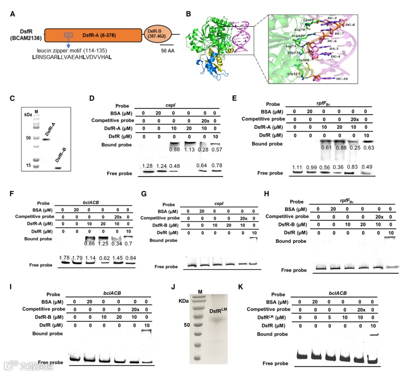 接着,作者又通过SMART和蛋白质基序分析网站分析,DsfR具有N-AMP结合结构域(DsfR-A),包含一个亮氨酸拉链基序,以及AMP结合酶C末端结构域(DsfR-B)。利用HDOCK服务器预测DsfR与DNA结合位点的相互作用,并通过EMSA实验进一步去验证这一预测(图4A-4B)。结果表明,DsfR-A结构域能与DNA启动子片段结合,而DsfR-B不能(图4C-4I)。进一步的突变分析显示,DsfR-A结构域中的亮氨酸拉链基序对其DNA结合至关重要,突变后无法形成DNA-蛋白质复合物,证明亮氨酸拉链在DsfR调控基因表达中起关键作用(图4J-4K)。