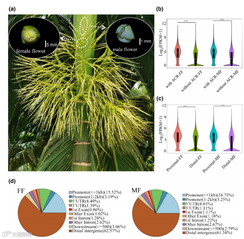 图6.槟榔花雌花和雄花形态与ATAC-seq分析