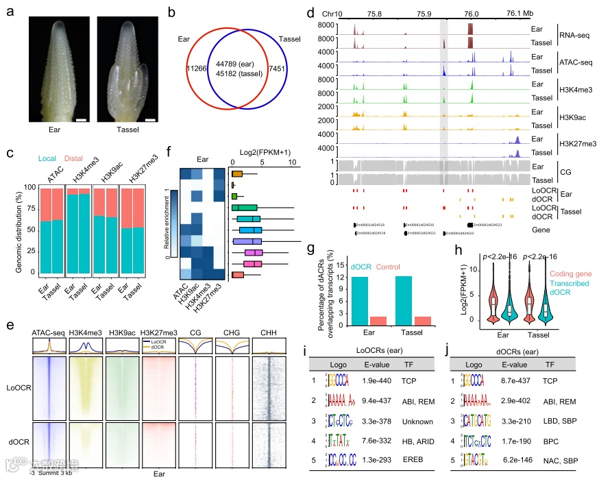 图4.玉米穗和穗轴的OCRs和表观基因组标记的特征