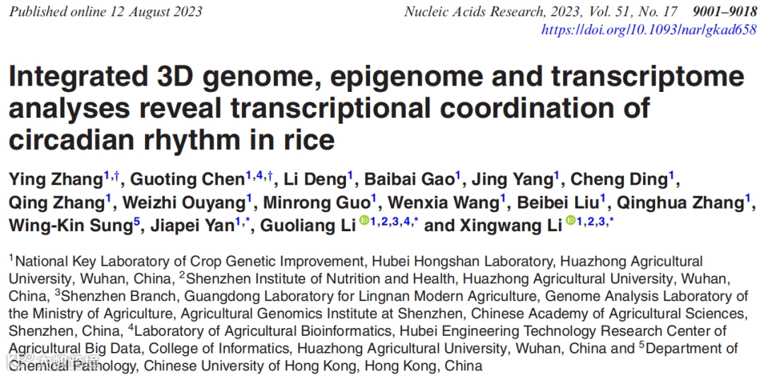Zhang Y, Chen G, Deng L, et al. Integrated 3D genome, epigenome and transcriptome analyses reveal transcriptional coordination of circadian rhythm in rice[J]. Nucleic Acids Research, 2023, 51(17): 9001-9018. -