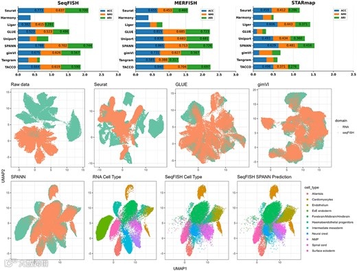 文章展示了使用不同算法对胚胎seqFISH与scRNA数据集进行映射的结果。在对齐之前,两个数据集的UMAP可视化之间几乎没有重叠。这表明了在scRNA-seq和空间转录组数据之间进行比对的必要性。而在映射后,SeqFISH簇可分离性较好,细胞类型对应关系较为明确。并且相对于其他算法而言(如Seurat、Liger、GLUE和Uniport),SPANN拥有更紧凑的聚类和更少的异常值。