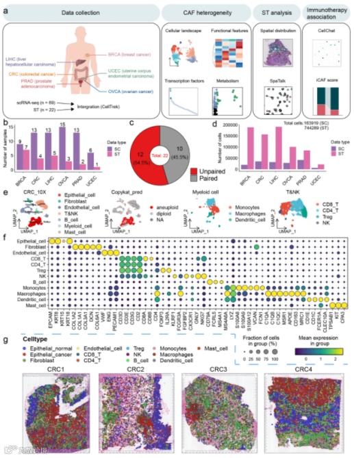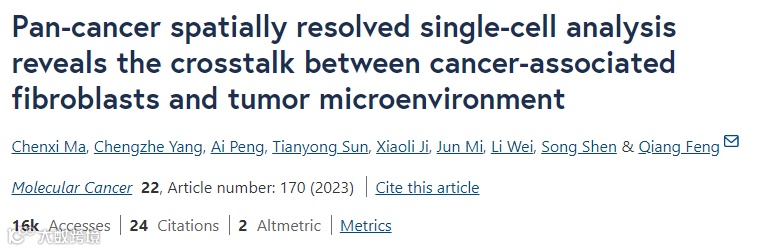 癌症相关成纤维细胞(CAFs)是一种异质性细胞群,在重塑肿瘤微环境(TME)中起着至关重要的作用。目前,包括免疫治疗和化疗在内的大多数治疗方法在很大程度上忽视了CAFs的关键作用。对CAFs和TME成分之间相互作用的理解不足以支持可靠治疗策略的发展。在这项研究中,作者描绘了六种常见癌症类型中CAF的格局,并描述了这些亚型的独特功能特征。通过整合scRNA-seq数据和ST数据生成了跨越6个肿瘤的空间单细胞转录组图谱,用于描述CAFs的空间分布特征,并表征CAFs与TME之间的复杂相互作用。本文利用celltrek将scRNA的数据映射到了ST空间图谱中,最终获得了包含744,289个细胞的泛癌空间单细胞转录图谱。