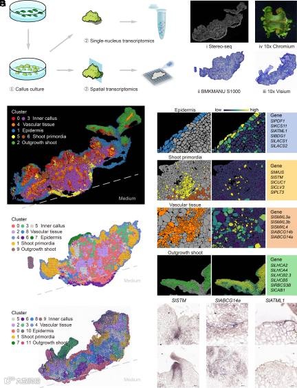 愈伤组织是一种在作物工程中参与植物再生和基因转化的重编程细胞团。多能愈伤组织通过芽再生发育成可育芽。作物愈伤组织中茎再生过程的分子基础在很大程度上仍然难以捉摸。本研究对番茄愈伤组织再生过程中的空间转录组(多种空转手段)进行了初步探索。文章使用seurat对空转数据进行了聚类,并原位呈现出了7个cluster的精确空间分布。注释结果与解剖观察结果高度吻合,并且三种空间转录组测序结果具有一致性。