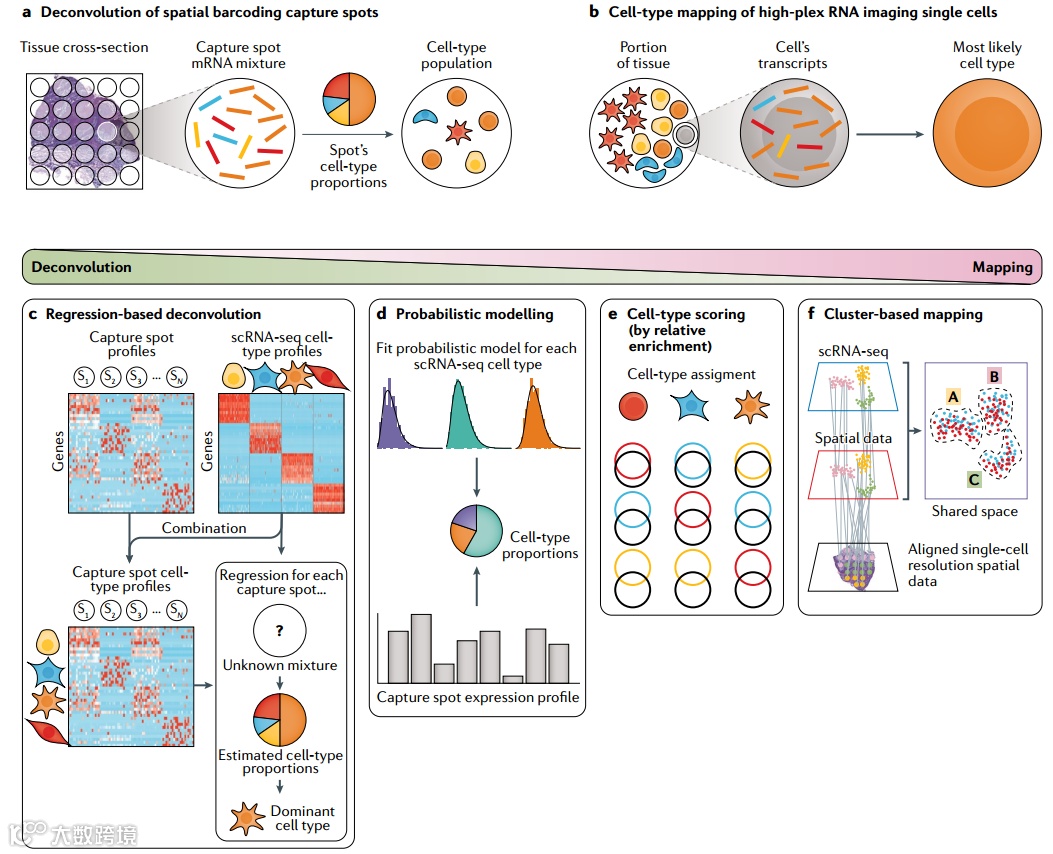 2021年,美国斯坦福大学回顾了整合scRNA-seq与空间转录组数据的多元化计算方法【1】。整合策略主要分为2种方式,去卷积(Deconvolution)以及映射(Mapping)。