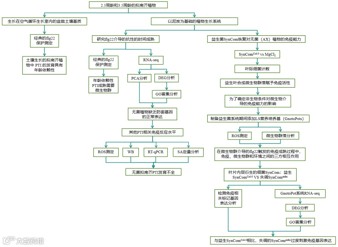 在最近的一项研究中,作者报道了两种基于泥炭的益生植物生长系统FlowPot和GnotoPot43,以及两种合成细菌群落,一个来自健康拟南芥叶子的真生菌群落,一个来自拟南芥min7 fls2 efr cerk1 (mfec)四重突变体叶子的失调菌群落,该突变体缺乏维持益生内生细菌群落的能力。在这里,作者利用这些材料来解决有关内源微生物群在年龄相关抗性(ARR)发展中的作用以及益生菌在调节适当的植物基础免疫中的可能作用的问题。
