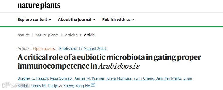2023年8月17日,美国杜克大学何胜洋团队及其合作者在Nature Plants(IF:18)期刊发表了题为“A critical role of a eubiotic microbiota in gating proper immunocompetence in Arabidopsis”的研究论文。该研究利用基于泥炭的益生植物生长系统,发现无菌植物缺乏年龄依赖性免疫力和正常的PTI响应,但叶合成微生物群可基本恢复这些缺陷;同时,失调微生物群会过度刺激免疫基因的表达;揭示了益生微生物群在调控植物正常免疫能力的重要作用。