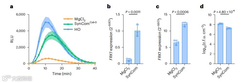 最近,作者从健康的拟南芥Col-0植株的叶片中组装了一个由内生细菌组成的48个成员的益生菌群SynComCol-0。为了确定从叶内球中提取的益生菌SynCom能在多大程度上恢复对AX植物的免疫能力,作者比较了添加和不添加SynCom的Col-0植株的PTI表型(SynComCol-0 vs MgCl2)。用‘MSU’土源微生物群培养的Col-0植株作为对照。作者观察到,在接种了“MSU”土源微生物群的HO植株和接种了SynComCol-0的植株中,flg22诱导了ROS的产生(图4a)。接下来,作者量化了flg22诱导的FRK1基因表达,并观察到经SynComCol-0定殖的植物恢复了flg22诱导的FRK1表达(图4b,c),这与在HO植物中观察到的结果相似(图1d,e)。此外,与用相同体积的10 mM MgCl2模拟接种的AX植株相比,经SynComCol-0定殖的植株具有更高的BAK1蛋白水平,并且对Pst DC3000感染的抗性更强(图4d)。综上所述,这些结果表明,叶片内球来源的细菌SynCom可以大幅恢复AX植物的免疫能力,类似于天然土壤来源的微生物群。