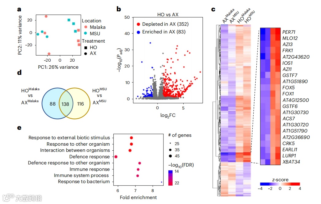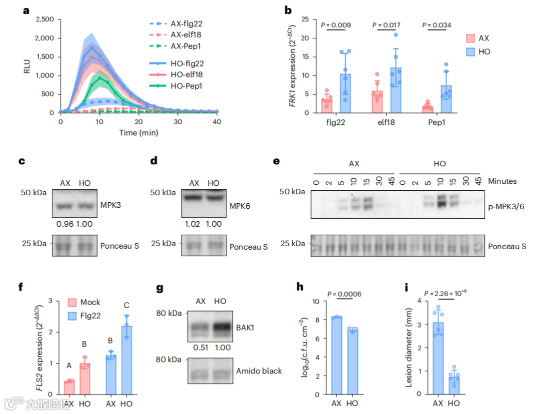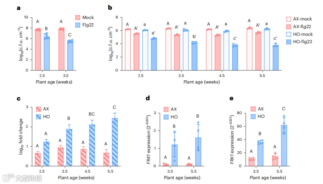 接下来,作者量化PTI标记基因FLG22诱导的受体样激酶1(FRK1)的表达,以进一步表征HO植物中PTI的年龄依赖性激活和AX植物中PTI的明显缺乏。虽然FRK1在3.5周和5.5周龄的HO植株中的基础表达相似(图1d),但flg22在年长的HO植株中诱导的FRK1表达水平高于年轻的HO植株(图1e)。有趣的是,FRK1在AX植物中的基础表达低于年轻或老年HO植物(图1d),值得注意的是,在AX植物中没有观察到flg22诱导的FRK1表达随年龄的显著增加(图1e)。因此,AX中PTI的年龄依赖性成熟的降低与FRK1基因的年龄依赖性表达的稳健增加的缺乏相关。