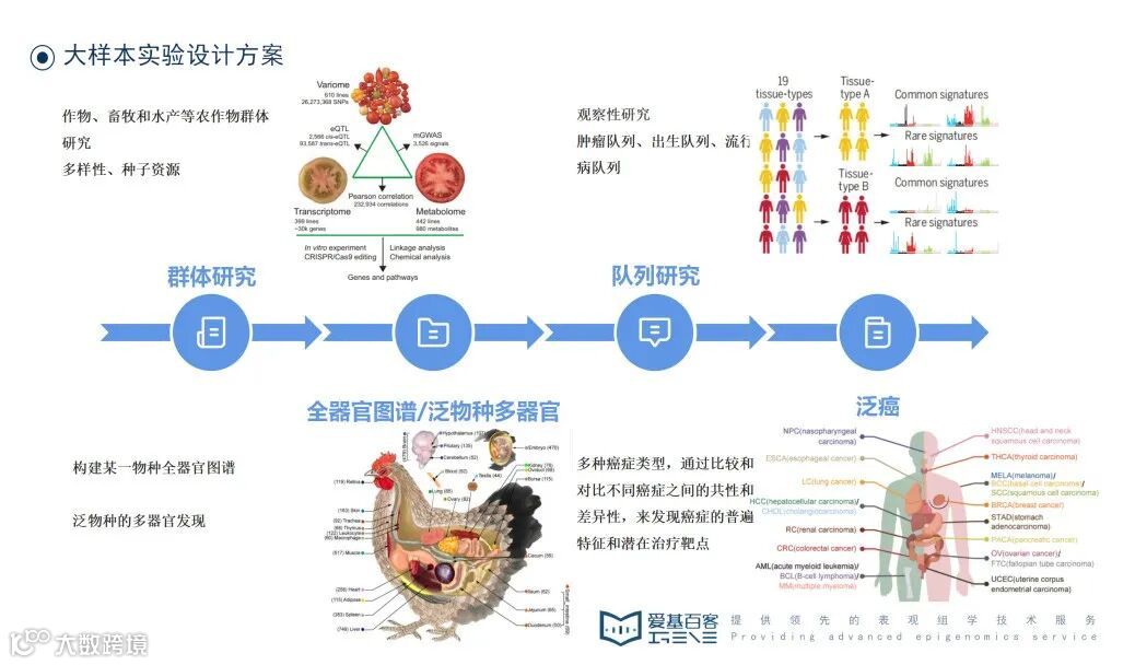 针对大样本量组学实验设计上农学和医学上有差异,农学上主要有群体研究、跨/全器官图谱、泛物种+多器官等,医学上大样本量研究主要有队列研究和泛癌分析。