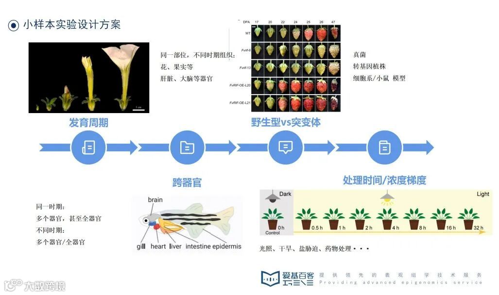 小样本量实验设计方案主要有4种类型:发育周期、跨器官、野生型vs 突变体、处理时间/浓度梯度。