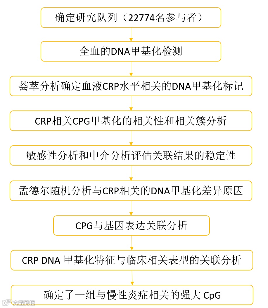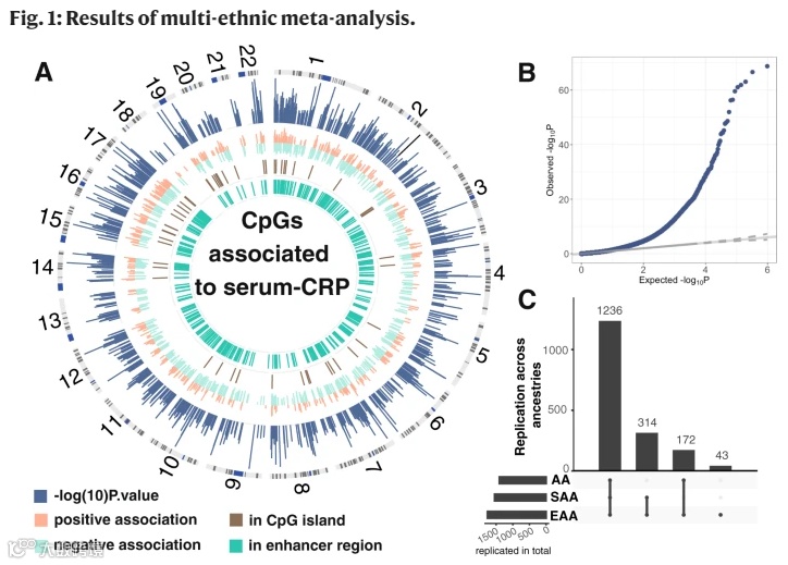 在基于人群的研究中,C反应蛋白 (CRP)(一种急性期反应物)通常用作慢性低度炎症的代表。低度炎症在多种疾病的发展中起着关键作用,例如2型糖尿病 (T2D) 、冠心病和其他心血管疾病、慢性阻塞性肺疾病 (COPD) 以及多种心理疾病创伤后应激综合症、精神分裂症和抑郁症等疾病。研究者对22,774名个体进行了多民族表观基因组关联研究,以描述C反应蛋白(CRP)衡量的慢性低度炎症的DNA甲基化特征。研究发现1,511个与CRP相关的独立差异甲基化位点,这些CpG位点在染色体上显示出相关结构,主要位于异染色质中,CpG岛中则较少,并且这些基因组位点主要位于转录因子结合位点和基因组增强子区域。孟德尔随机化分析表明,改变的CpG甲基化是血CRP水平增加的结果。中介分析揭示了肥胖和吸烟是改变CpG甲基化的重要驱动因素。最后,研究者发现激活的CpG特征显著增加了心代谢疾病和COPD的风险。