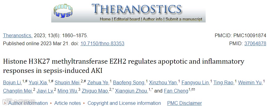 4.Li B, Xia Y, Mei S, et al. Histone H3K27 methyltransferase EZH2 regulates apoptotic and inflammatory responses in sepsis-induced AKI[J]. Theranostics, 2023, 13(6): 1860.