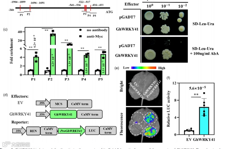 后续通过ChIP-qPCR、酵母单杂和双荧光素酶报告基因实验,发现GhWRKY41可直接结合并驱动自身的表达。通过筛选黄萎病菌接种到棉花根部的酵母双杂交文库,发现GhWRKY41可与自身发生互作而形成同源二聚体后直接激活GhC4H和Gh4CL的表达,从而调节木质素和黄酮类化合物的积累。