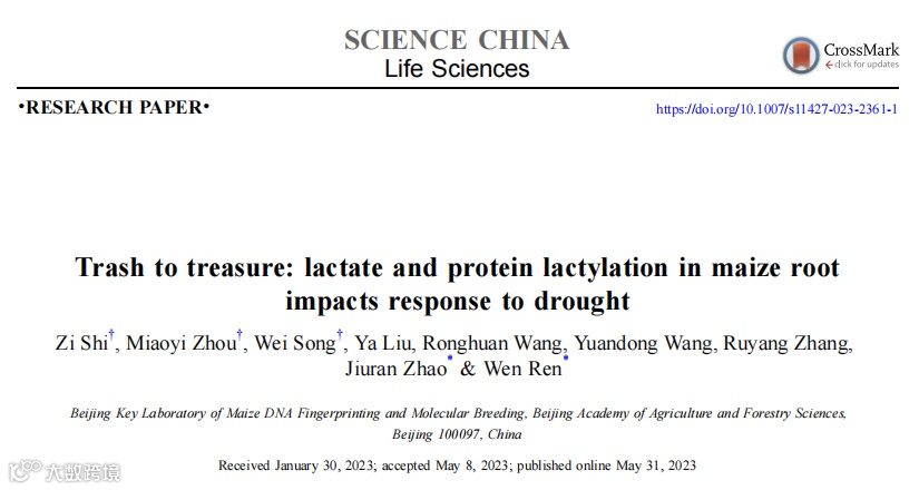 今年5月份,北京市农林科学院玉米研究所任雯副研究员和首席科学家赵久然研究员团队在《Science China Life Sciences》(TF = 10.372)杂志上发表了题为“Trash to treasure: Lactate and protein lactylation in maize root impacts response to drought”的文章,该研究首次发现玉米中存在乳酸和乳酸化修饰现象,且在根中响应了干旱胁迫[3]。为植物中乳酸和乳酸化修饰的研究拓宽了领域,为深入理解翻译后修饰在植物根系干旱抵抗作用中的分子机制提供了重要线索。