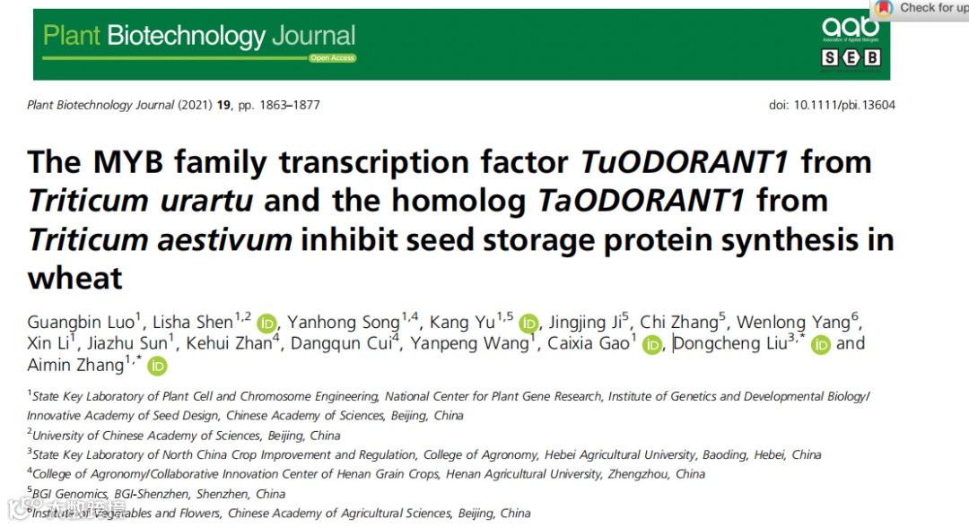 2021年中国科学院遗传与发育生物学研究所张爱民研究团队在《Plant Biotechnology Journal》(TF=13.263)发表“The MYB family transcription factor TuODORANT1 from Triticum urartu and the homolog TaODORANT1 from Triticum aestivum inhibit seed storage protein synthesis in wheat”文章,揭示了来自Triticum urartu的MYB家族转录因子TuODORANT1和来自普通小麦的同源物TaODORANT1抑制小麦种子贮藏蛋白的合成[1]。