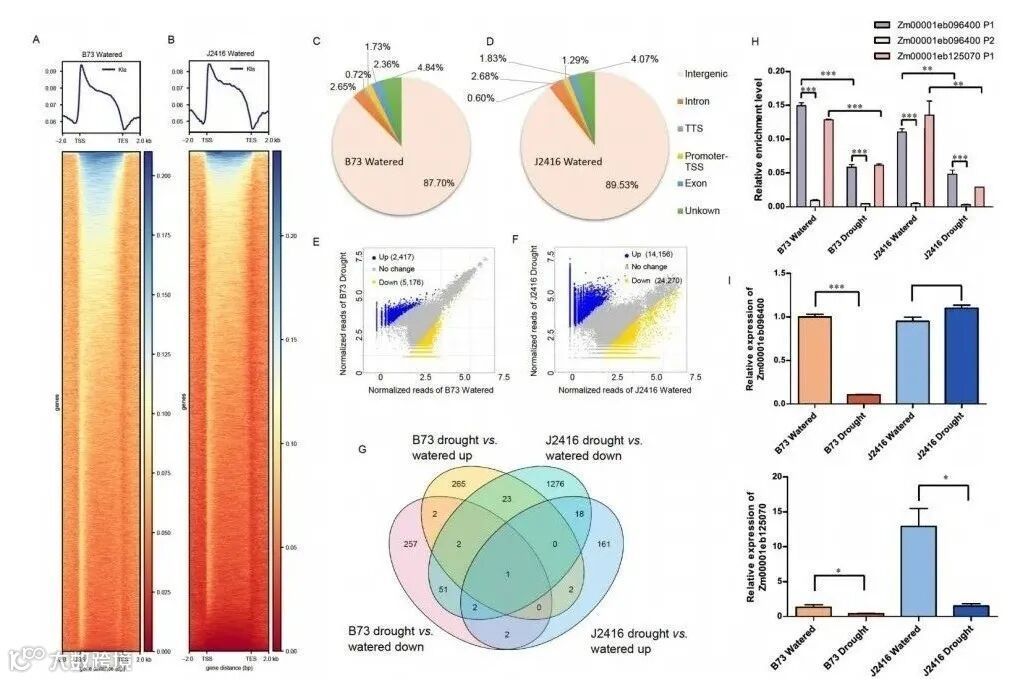 通过ChIP-Seq分析,进一步探索玉米根系中组蛋白Kla标记的全基因组分布。发现约有28-48K的组蛋白存在乳酸化修饰,不同于其他的酰化修饰,约90%的乳酸化修饰都存在于基因间区,只有6%存在基因区。并且在干旱条件下B73和京2416的具有明显差异,只有2.7%组蛋白Kla是两个品系共有的,表明非生物胁迫在不同玉米种质中触发的表观遗传活性有所差异。动物中已知的乳酸化抑制剂对玉米的乳酸化均未产生影响,而外源施加生长调节剂亚精胺不仅提高了B73的耐旱性能,同时显著改变了乳酸、乳酸化和组蛋白Kla修饰的水平。