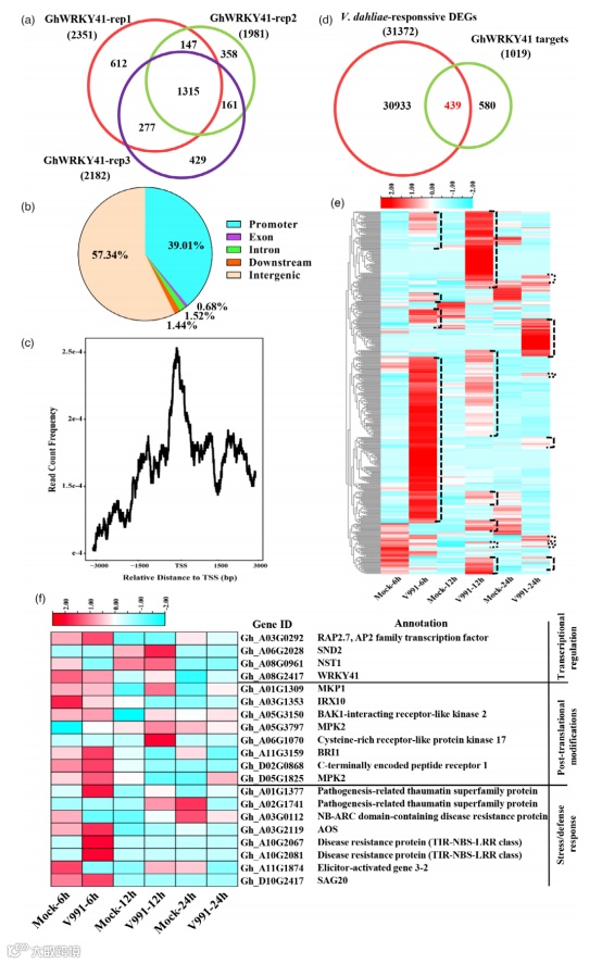 为进一步解析GhWRKY41介导棉花抗病性的分子机理,作者进行了ChIP-seq和RNA-seq分析,鉴定到1019个GhWRKY41的靶标基因。这些靶标基因中有439个(43.1%)在棉花接种黄萎病菌后响应其侵染,推测GhWRKY41可能通过调控这439个靶标基因介导棉花的免疫反应过程。除此之外,在响应病菌侵染的439个基因中,部分上调基因的注释结果显示与应激/防御反应、转录调控和翻译后修饰有关,包括一些苯丙素代谢主开关、受体激酶和抗病相关蛋白。