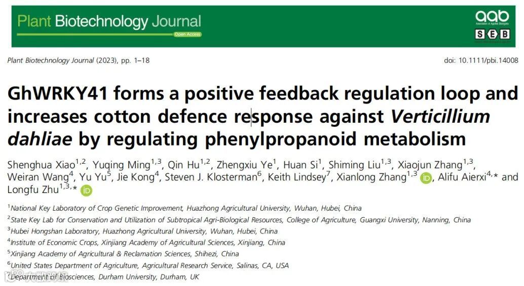 今年,华中农业大学作物遗传改良国家重点实验室棉花研究团队朱龙付教授课题组联合新疆农科院阿里甫艾尔西研究员在《Plant Biotechnology Journal》(TF=13.263)杂志发表了题为“GhWRKY41 forms a positive feedback regulation loop and increases cotton defense response against Verticillium dahliae by regulating phenylpropanoid metabolism”的文章,该文解析了WRKY转录因子GhWRKY41与自身形成一个正反馈调节环,通过调节苯丙烷代谢介导棉花对黄萎病菌产生抗性的分子机制[2]。