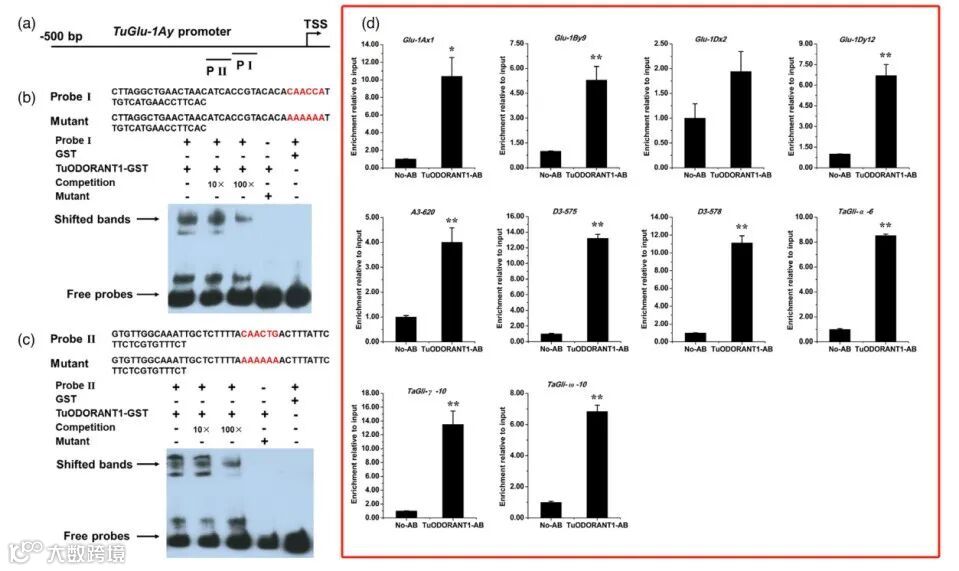 EMSA和ChIP-qPCR分析表明,TuODORANT1在体外和体内均与SSP基因启动子的顺式元件结合。普通小麦中的同源基因TaODORANT1在体外将SSP基因的启动子活性和转录均抑制了1-112倍,TaODORANT1的敲除导致SSP基因的转录增加了14.73%–232.78%,从而导致SSP总水平升高了11.43%–19.35%。