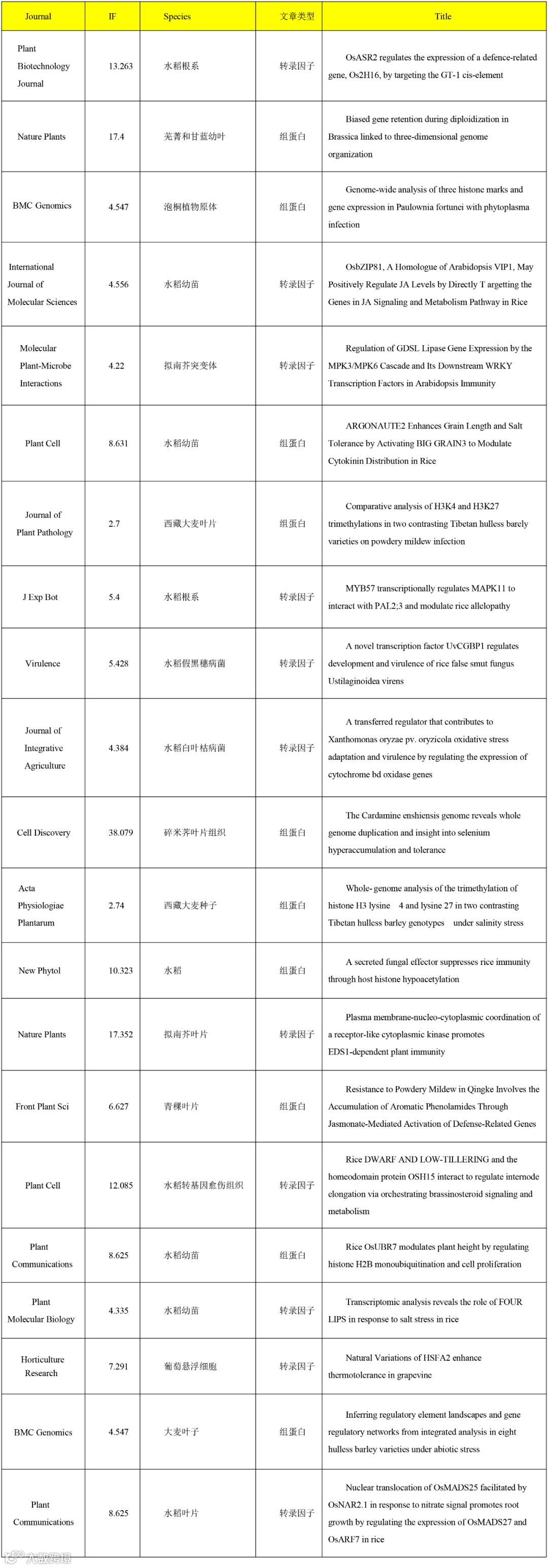 物种经验丰富:番茄、花生、玉米、红豆杉、葡萄、拟南芥、水稻、烟草、柑橘、马铃薯、白菜、大豆、小麦、油菜、短柄草、桃、苹果、月季、棉花、黑麦草、香蕉、泡桐、首蓉、甜瓜、黄瓜、梨、竹节参、海带、碎米莽、杨树、龙眼、茶树、凤梨、菠萝、嵩草、矮牵牛、龙血树、猕猴桃、铁皮石斛、白木香、疾藜、康乃馨、葛根、草莓、木薯...... -