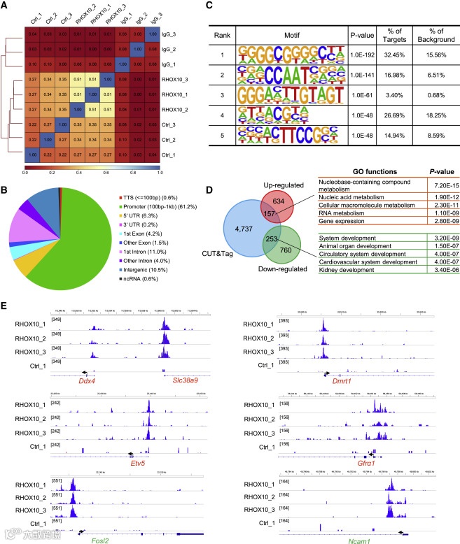 在该研究中,作者构建了敲除细胞系,将敲除细胞系和野生细胞系进行转录组。根据差异基因,获取候选调控基因。然后,利用CUT&Tag鉴定RHOX10的靶基因。最后,利用qPCR和EMSA来做功能验证。