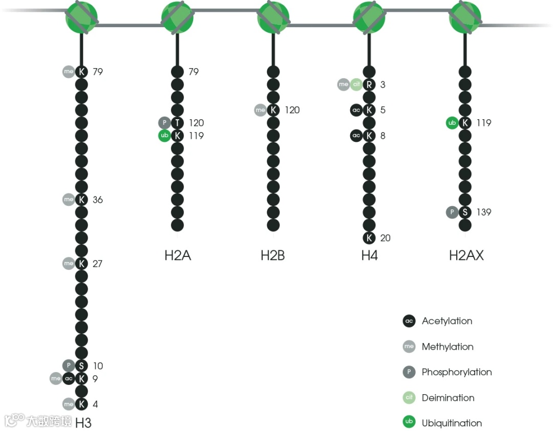 (2)组蛋白修饰,染色体的基本单位——核小体是由组蛋白和DNA构成的。组蛋白上会发生诸多的修饰,而且这种修饰具有很强的丰富性。这种丰富性一方面体现在修饰的位置,另一方面体现在修饰的类型,比如甲基化、乙酰化、泛素化、乳酸化等。位置和修饰类型的差异赋予了组蛋白不同的调控功能,主要分为激活类和抑制类。
