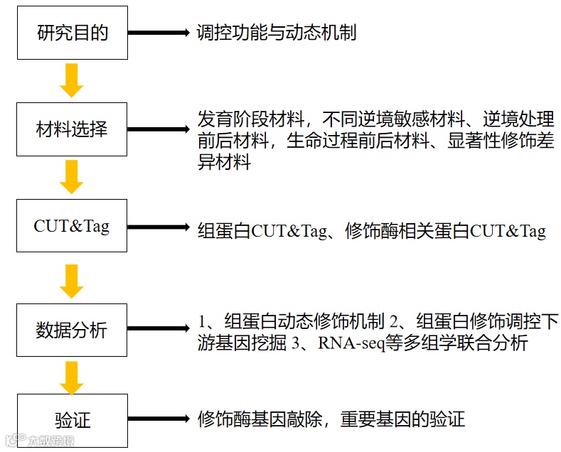 该研究思路可以应用至组蛋白修饰的研究。首先根据研究目的选择不同发育阶段材料,不同逆境敏感材料,逆境处理前后的材料等。然后,利用CUT&Tag去分析组蛋白修饰差异。挖掘组蛋白动态修饰机制,可以通过CUT&Tag挖掘调控的下游基因;联合其他组学比如转录组来挖掘组蛋白修饰变化影响哪些基因的表达。最后,对相关结果进行验证。